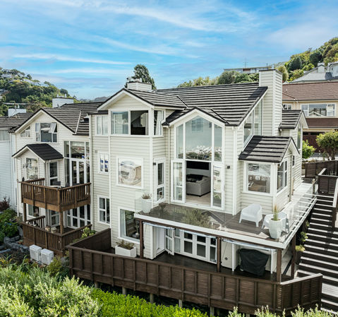 • Open-plan layout with living, dining and kitchen all enjoying glorious views of Wellington harbour and the city, with double doors out to the top deck • Contemporary kitchen for both entertaining and family living, with quality appliances including a gas/electric large free-standing range, double dish draw and refrigerator with filtered cold water and ice maker • Stylish ceiling fans in the lounge and master bedroom coupled with a modern heat pump in the lounge and electric skylights in the upstairs bathroom • Private mezzanine floor leading to the expansive primary suite with stunning harbour views, and a modern bathroom with a bath which boasts "the best views in Wellington". This ensuite has two electrically controlled skylights and under floor heating. The connected walk-in robe is fitted with configurable organizers • Adjacent double bedroom could also be used as an executive home office or nursery • Lower level has two very large bedrooms with adjoining ensuite bathroom with underfloor heating. Both rooms open onto a large under cover decking area with café blinds, making an all-weather outdoor sheltered area • Handy large storage room as a gym, media room, cellar or simply for all the family tools and toys • Large internal access double garage with workbench, internal washing line, wifi enabled insulated garage door, extensive storage and a modern laundry
